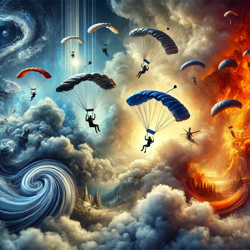 19. 낙하산이 한쪽으로 기울어지는 꿈 (혼재) – 기울어진 낙하산은 불균형과 예상치 못한 위험을 나타내지만, 상황에 따라 수정하면 성공으로 전환될 수 있음을 암시합니다.
