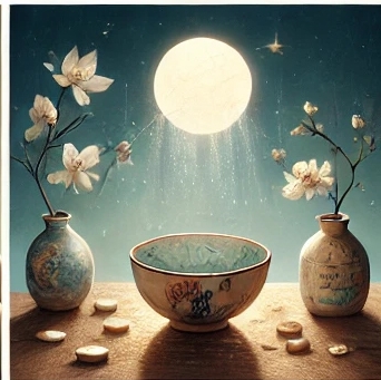 50. 도자기 그릇이 고요한 분위기 속에 배치된 꿈 (길몽) – 고요한 분위기 속의 도자기 그릇은 내면의 평화와 정돈, 그리고 미래에 대한 확신을 상징하며, 긍정적 변화를 예고합니다.