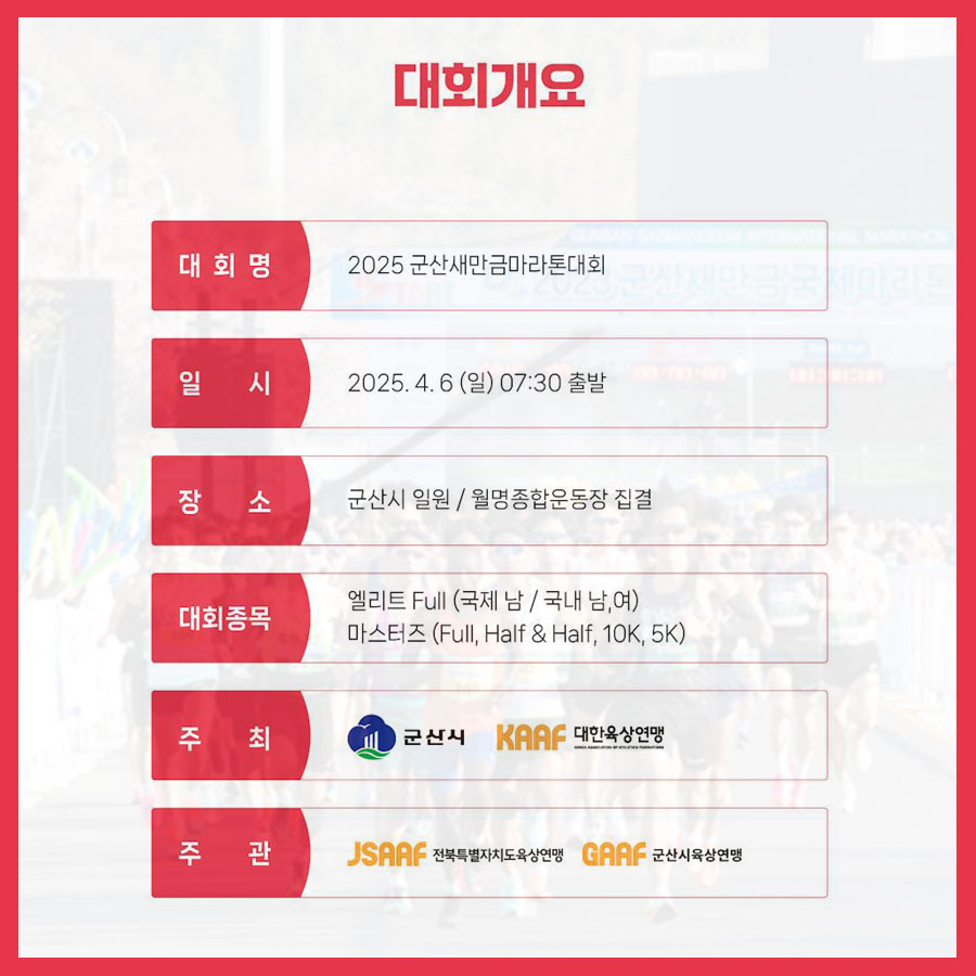 국내 엘리트 정상급 선수와 국내외 마라톤 동호인, 시민들이 함께하는 행사로, 풀코스(42.195km), 10km, 5km 3가지 종목으로 진행됩니다. 군산시의 아름다운 경관을 배경으로 한 이번 대회는 참여자들에게 잊지 못할 추억을 선사할 것입니다.