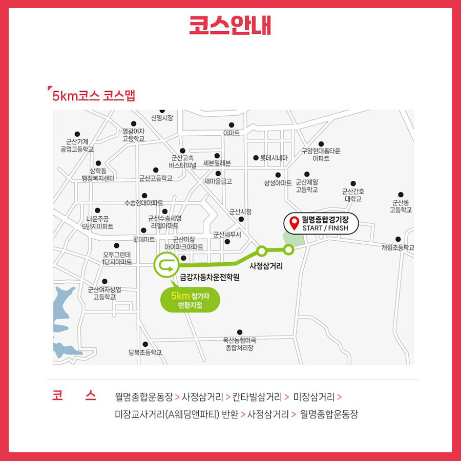 | 5km | 5km | 가족 단위 참가자나 걷기를 선호하는 분들을 위한 코스입니다. |